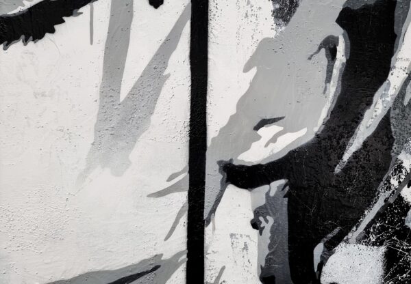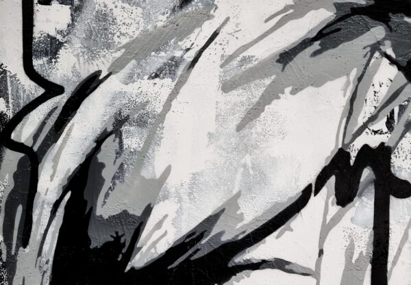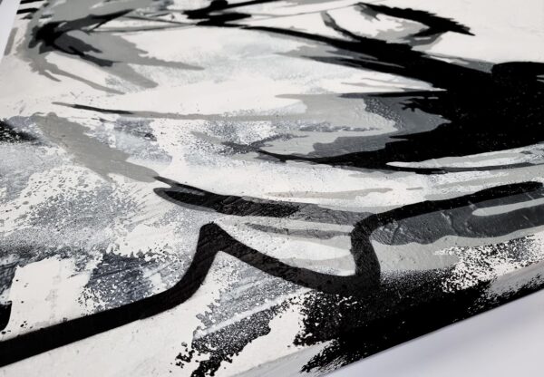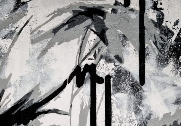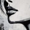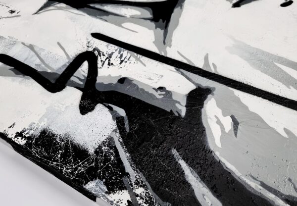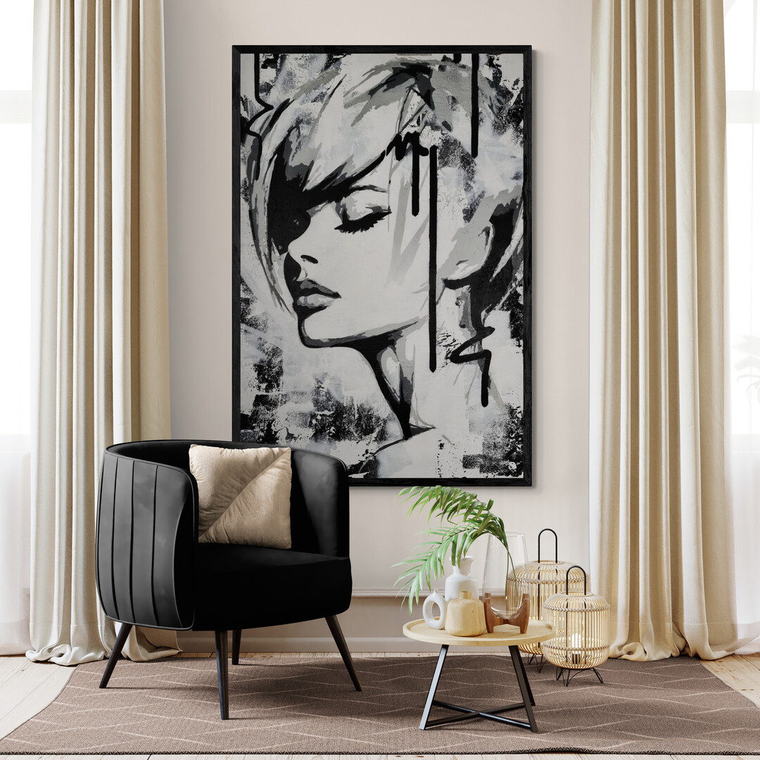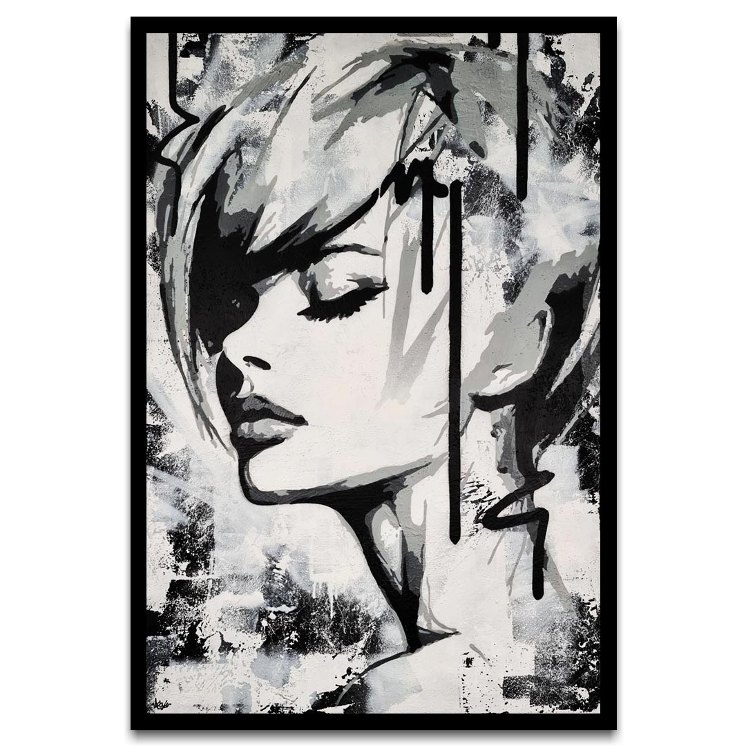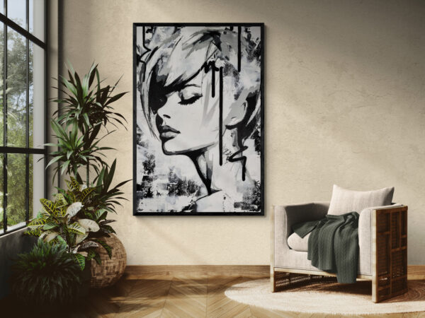 This monochromatic artwork captivates with its bold blend of abstract expressionism and portraiture. The piece portrays a stylized female profile, her eyes closed, encapsulating serenity and introspection. Stark black lines and subtle grey hues create a dynamic contrast, emphasizing the sleek contours of her face and hair. The expressive brushstrokes suggest depth and movement, imparting an almost ethereal quality. Unique to this work is its fusion of traditional portrait elements with graffiti-inspired drips and textures, adding a modern, edgy layer. The background’s distressed texture provides a gritty yet harmonious backdrop, enhancing the artwork’s emotional intensity. An exemplary contemporary piece, it invites viewers to explore the duality of calmness and complexity.