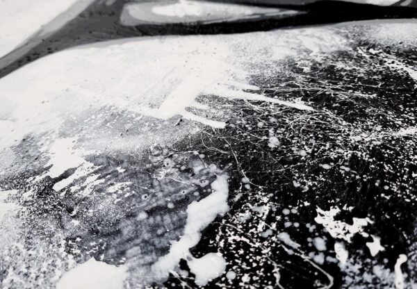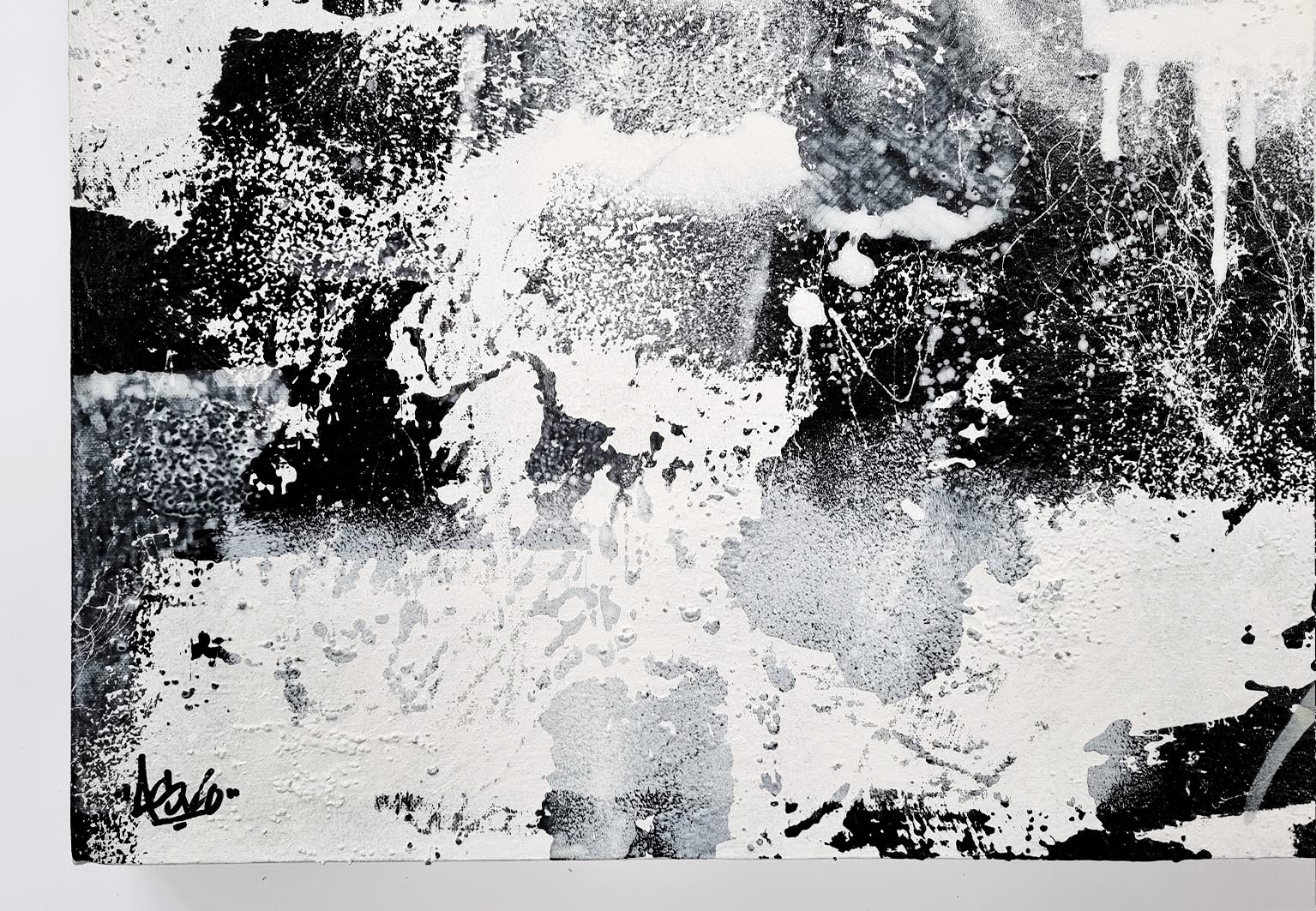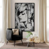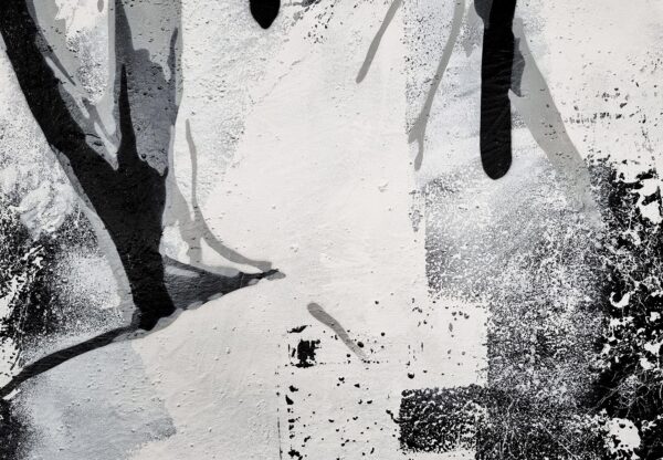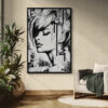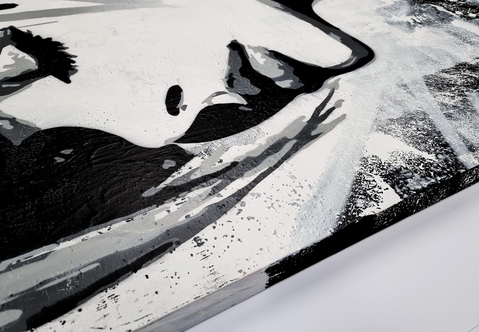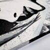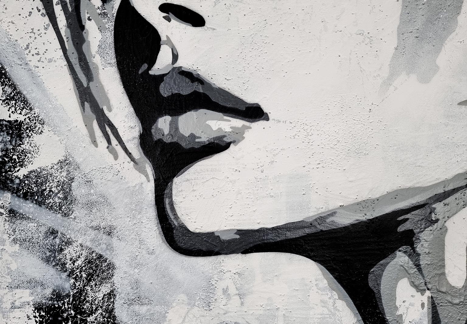 This monochromatic artwork captivates with its bold blend of abstract expressionism and portraiture. The piece portrays a stylized female profile, her eyes closed, encapsulating serenity and introspection. Stark black lines and subtle grey hues create a dynamic contrast, emphasizing the sleek contours of her face and hair. The expressive brushstrokes suggest depth and movement, imparting an almost ethereal quality. Unique to this work is its fusion of traditional portrait elements with graffiti-inspired drips and textures, adding a modern, edgy layer. The background’s distressed texture provides a gritty yet harmonious backdrop, enhancing the artwork’s emotional intensity. An exemplary contemporary piece, it invites viewers to explore the duality of calmness and complexity.