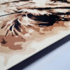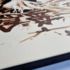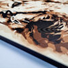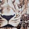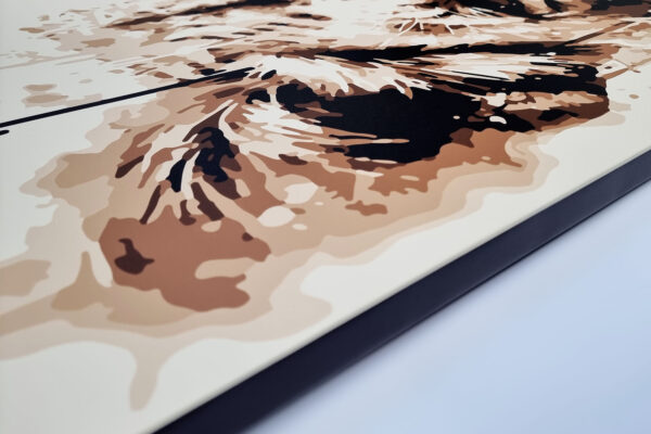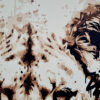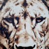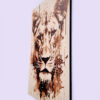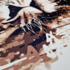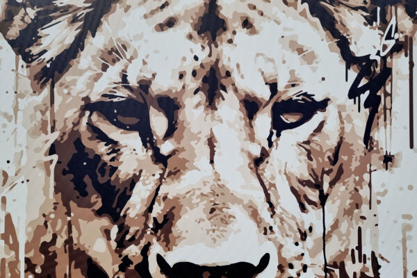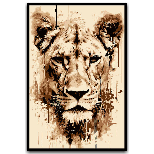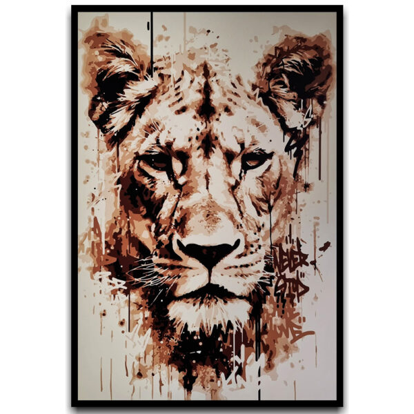 This striking artwork presents a lion’s face rendered in a modern, urban style. The use of a limited color palette dominated by earthy browns and blacks adds to the raw intensity of the image. The lion’s piercing gaze commands attention, capturing the majestic and untamed nature of the creature. Bold, dynamic brushstrokes and drip techniques give the piece an edgy, graffiti-like appearance, emphasizing movement and vitality. Intricate layering of textures adds depth, while the incorporation of graffiti elements and graffiti text infuses a contemporary, rebellious spirit. The juxtaposition of natural majesty with street art aesthetics creates a compelling visual dialogue, revealing the lion as a symbol of strength and defiance. This fusion of wildlife imagery with urban art techniques makes the piece uniquely captivating, embodying both elegance and power.