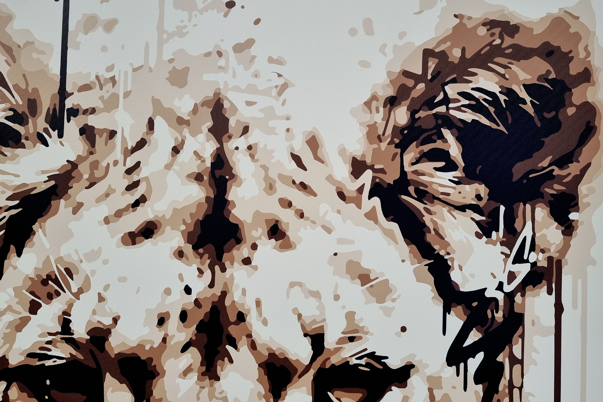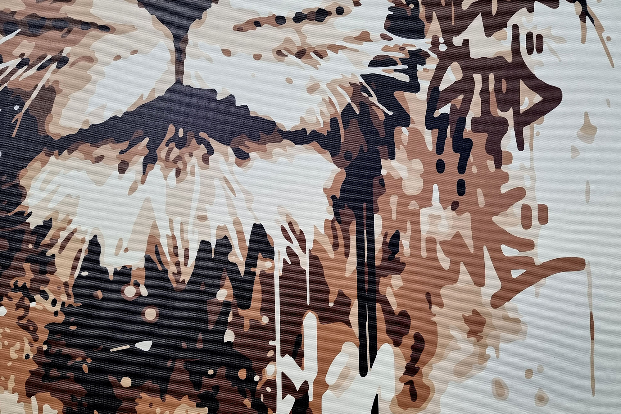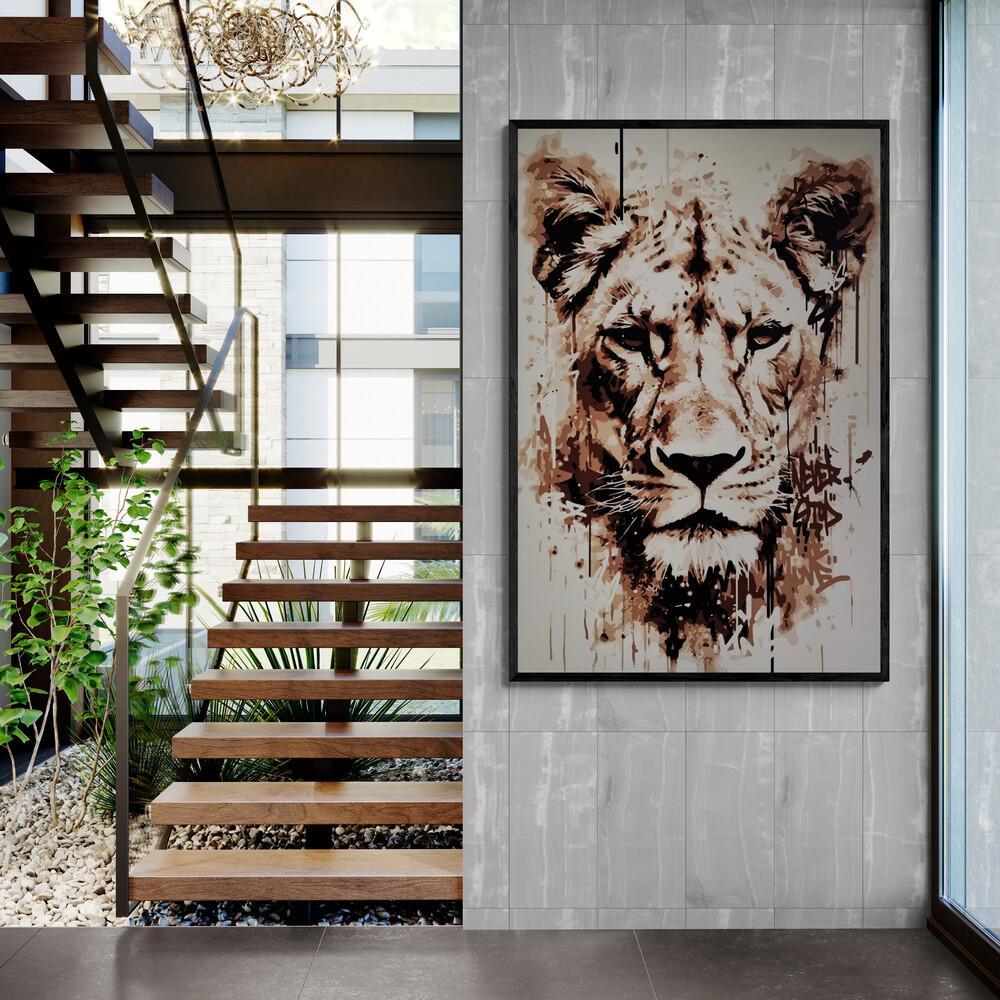 This striking artwork presents a lion’s face rendered in a modern, urban style. The use of a limited color palette dominated by earthy browns and blacks adds to the raw intensity of the image. The lion’s piercing gaze commands attention, capturing the majestic and untamed nature of the creature. Bold, dynamic brushstrokes and drip techniques give the piece an edgy, graffiti-like appearance, emphasizing movement and vitality. Intricate layering of textures adds depth, while the incorporation of graffiti elements and graffiti text infuses a contemporary, rebellious spirit. The juxtaposition of natural majesty with street art aesthetics creates a compelling visual dialogue, revealing the lion as a symbol of strength and defiance. This fusion of wildlife imagery with urban art techniques makes the piece uniquely captivating, embodying both elegance and power.