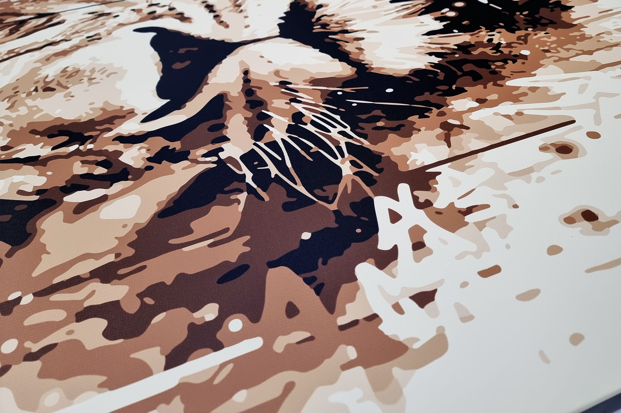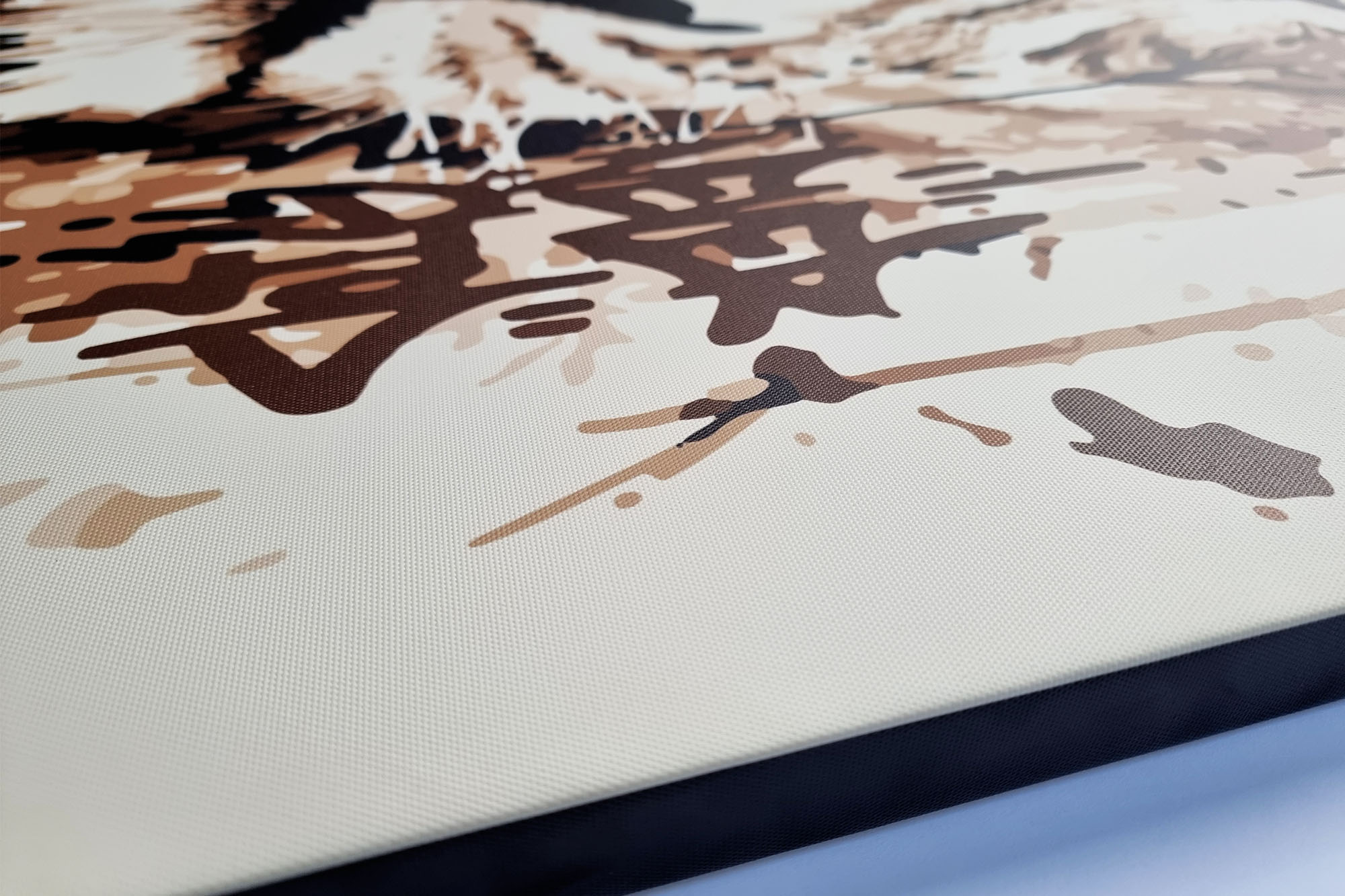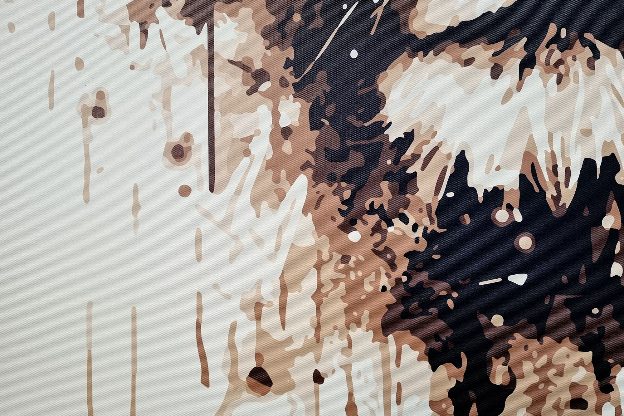 This striking artwork presents a lion’s face rendered in a modern, urban style. The use of a limited color palette dominated by earthy browns and blacks adds to the raw intensity of the image. The lion’s piercing gaze commands attention, capturing the majestic and untamed nature of the creature. Bold, dynamic brushstrokes and drip techniques give the piece an edgy, graffiti-like appearance, emphasizing movement and vitality. Intricate layering of textures adds depth, while the incorporation of graffiti elements and graffiti text infuses a contemporary, rebellious spirit. The juxtaposition of natural majesty with street art aesthetics creates a compelling visual dialogue, revealing the lion as a symbol of strength and defiance. This fusion of wildlife imagery with urban art techniques makes the piece uniquely captivating, embodying both elegance and power.