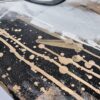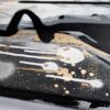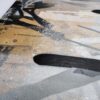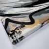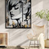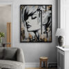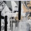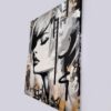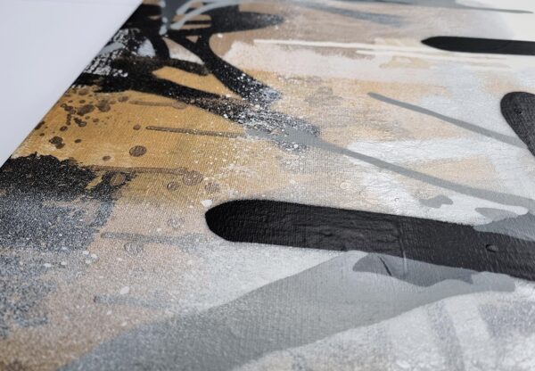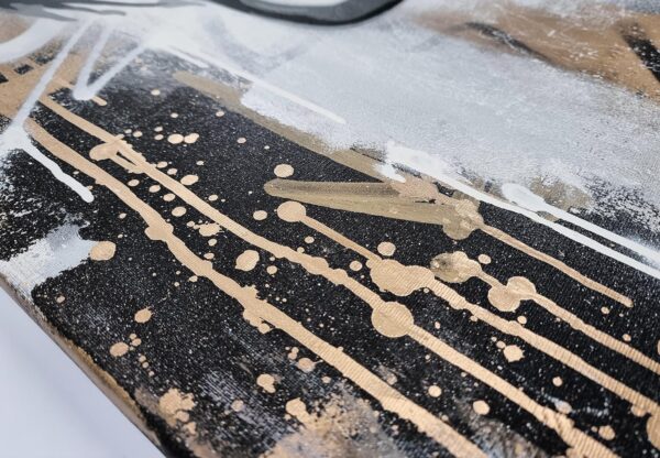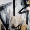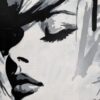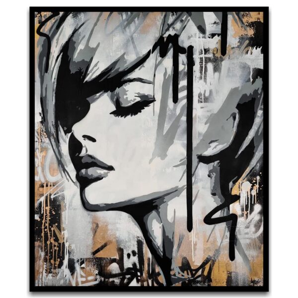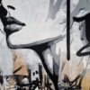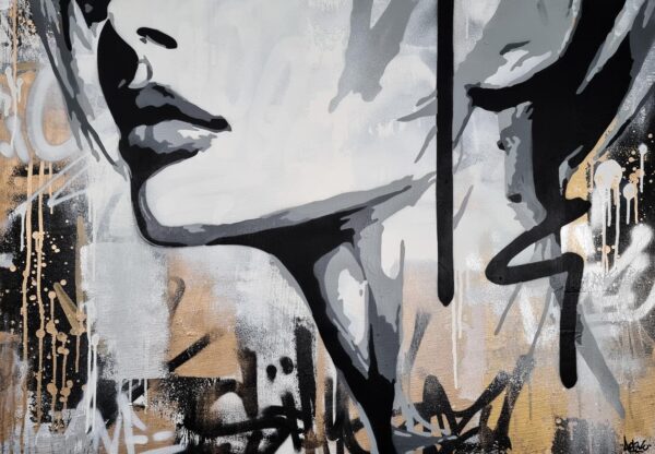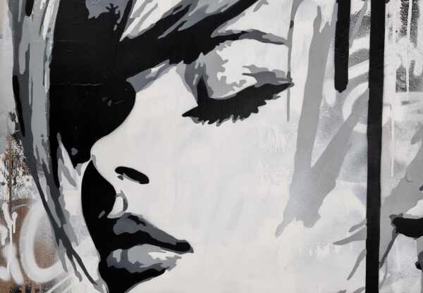 This artwork is a striking fusion of street art and portraiture, characterized by bold black and white contrasts. The subject, a woman’s serene profile, conveys elegance and introspection. Her closed eyes and slightly parted lips evoke a sense of calm and contemplation. Sharp, angular lines intersect the composition, adding dynamic energy and layering. The background features a textured, abstract mix of earthy tones—beige and muted grays—that complement the monochromatic subject. Drips and splatters of paint introduce a raw, spontaneous quality, reminiscent of urban graffiti. This piece uniquely combines the smooth grace of traditional portraiture with the edgy vitality of contemporary street art, creating an arresting visual experience that invites viewers to explore the interplay between chaos and tranquility.