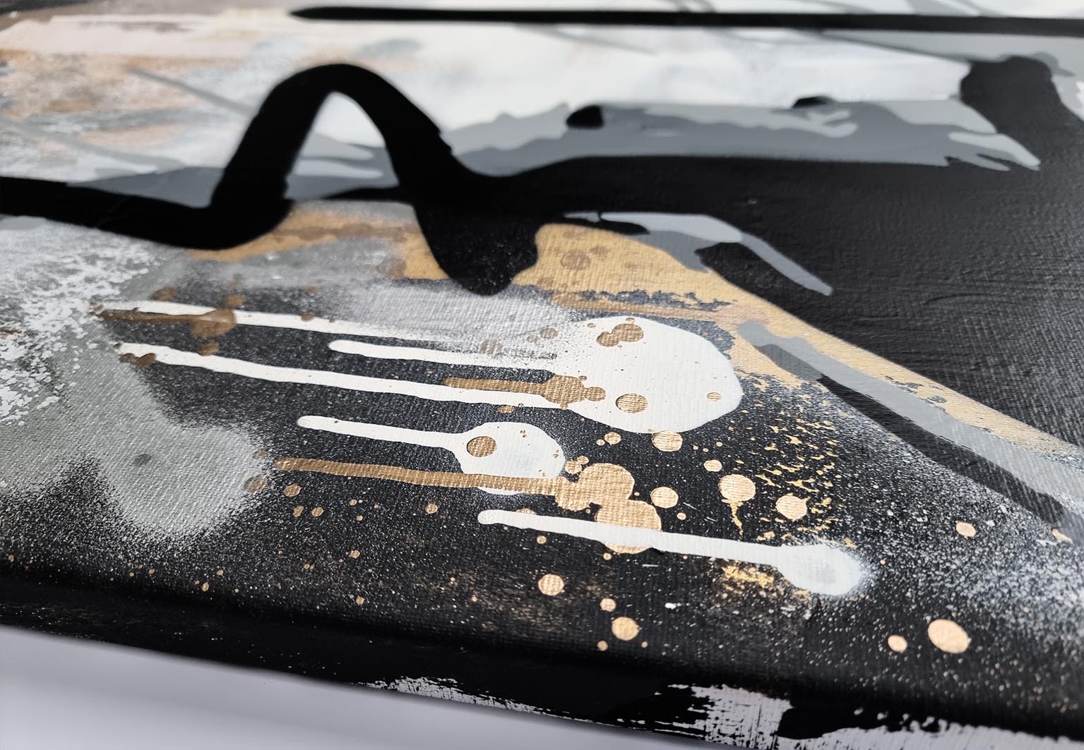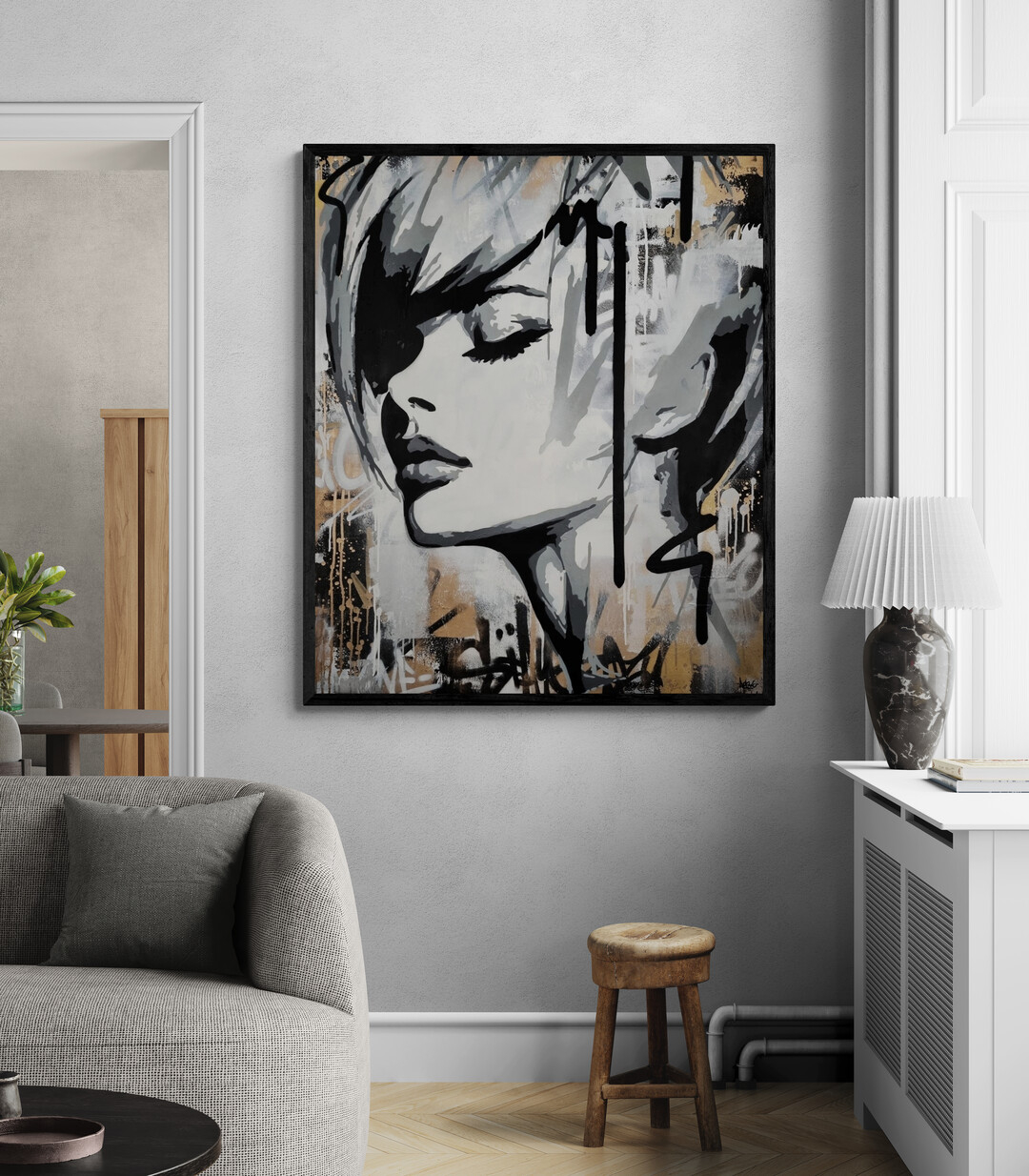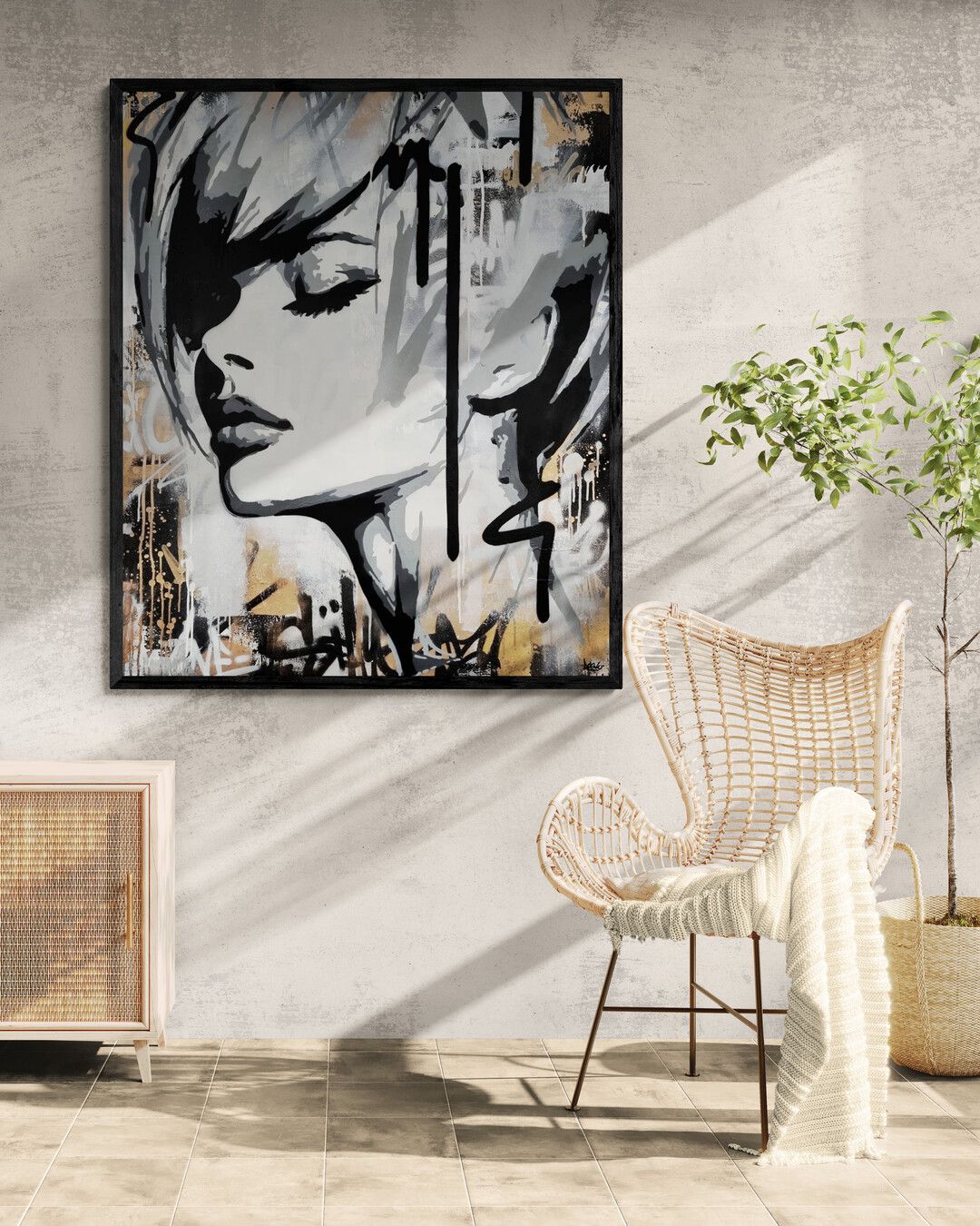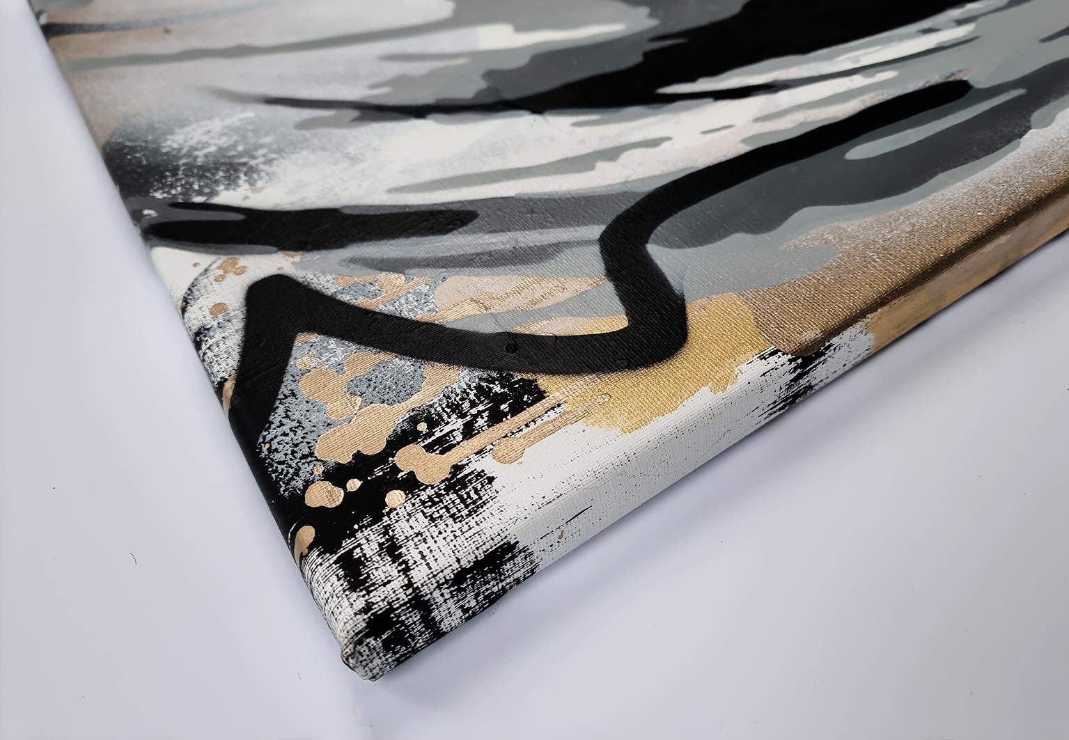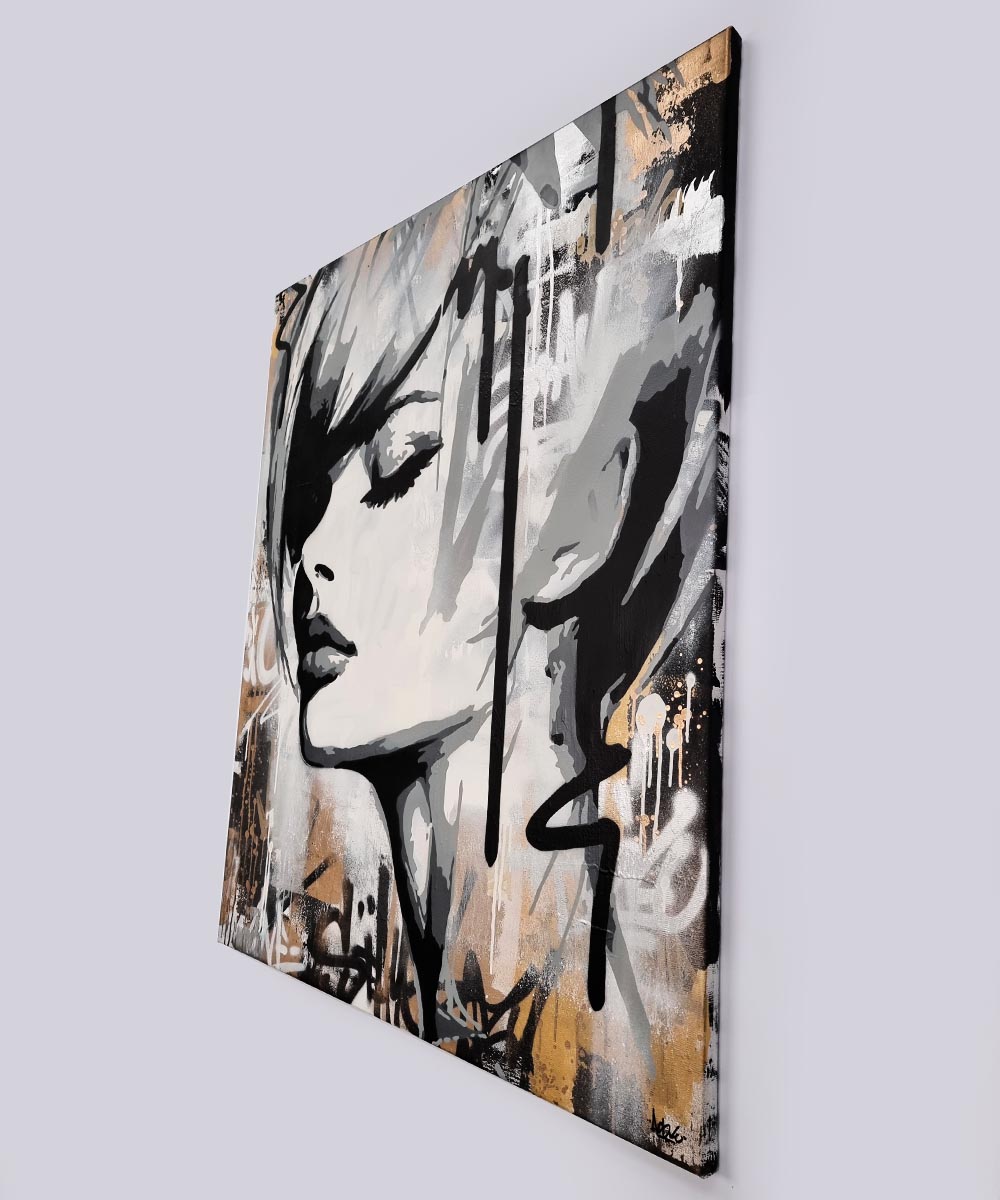 This artwork is a striking fusion of street art and portraiture, characterized by bold black and white contrasts. The subject, a woman’s serene profile, conveys elegance and introspection. Her closed eyes and slightly parted lips evoke a sense of calm and contemplation. Sharp, angular lines intersect the composition, adding dynamic energy and layering. The background features a textured, abstract mix of earthy tones—beige and muted grays—that complement the monochromatic subject. Drips and splatters of paint introduce a raw, spontaneous quality, reminiscent of urban graffiti. This piece uniquely combines the smooth grace of traditional portraiture with the edgy vitality of contemporary street art, creating an arresting visual experience that invites viewers to explore the interplay between chaos and tranquility.